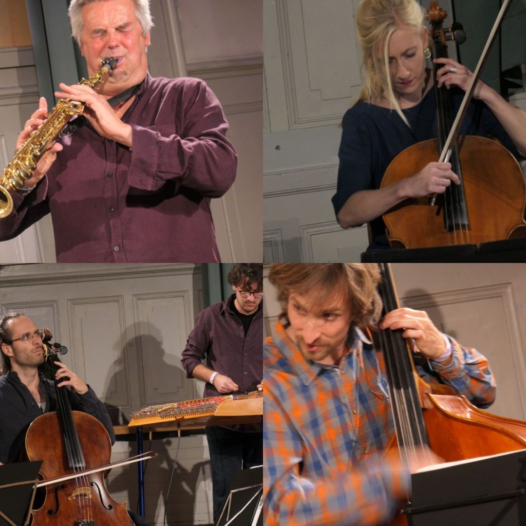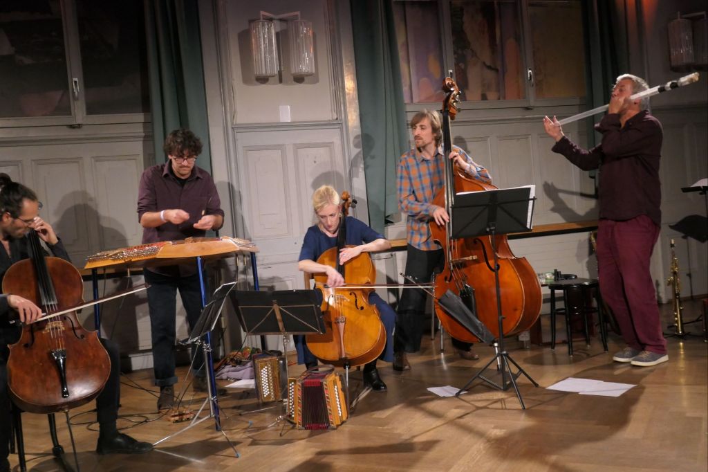Das war das dritte Konzert der Reihe Gränzgängig, eine Reihe mit Neuer Volksmusik, initiiert von der Musikgruppe Viertaktmotor. Dieses Mal waren Albin Brun (Saxophone, Schwyzerörgeli, Obertonflöte und Gadgets) und Kristina Brunner (Schwyzerörgeli und Cello) dabei. Viertaktmotor sind Nayan Stalder am Hackbrett, Raphael Heggendorn am Cello, Kaspar Eggimann am Akkordeon und Laurin Moor am Kontrabass. Sie starteten gleich zu sechst mit einer Komposition von Nayan Stalder. Es wechselten sich Kompositionen von Albin Brun, Kristina Brunner und eben Nayan Stalder ab.