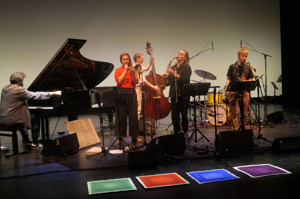 Das Sextett mit Sonja Ott an der Trompete und Komposition und Philippe Leibundgut am Schlagzeug und Komposition bestand noch aus Amalia Dahl am Altosaxophon, Helena Kay am Tenorsaxophon, François Lana am Piano und Jules Martinet am Kontrabass. Sonja Ott zählt zu den Menschen mit Synästhesie, das heisst, sie sieht bei Tönen und anderen Sinneswahrnehmungen Farben. Darum hat sie alle Stücke mit Farben benannt und setzte sich auch mit den Farben und deren Herstellung auseinander und erklärte das jeweils dem Publikum. Vor den Stücken legte sie eine Tafel mit der entsprechenden Farbe vorn auf den Boden.