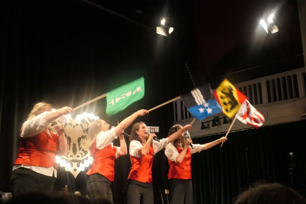 Dazwischen traten sie als Blasmusik auf, bei einer Tunneleinweihung. „Dr Tifel isch gstorbe“ fehlte ebenso wenig wie „Oh mein Papa“ welches natürlich zu „Oh meine Mama“ wurde. „Dr Joggeli wott go Birli schüttle“ bekam einen neuen Text. Dazwischen wurde auch Französisch, Deutsch und Italienisch gesungen. Das Singen und die Texte waren aber nur ein Teil der Show. Die Frauen passten die Kleider immer an, vom Sennenlook bis zum Glitzeroutfit sah man alles.